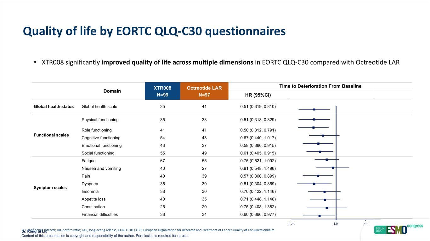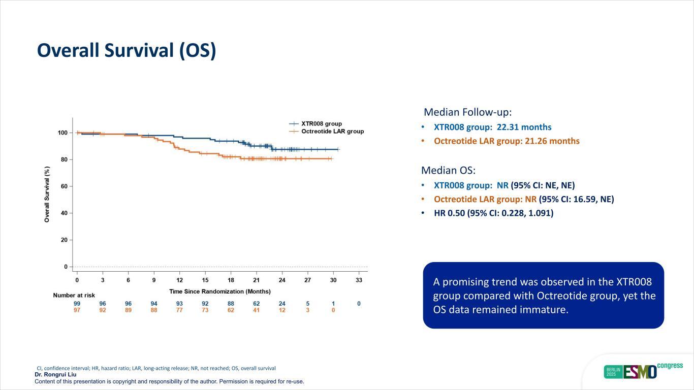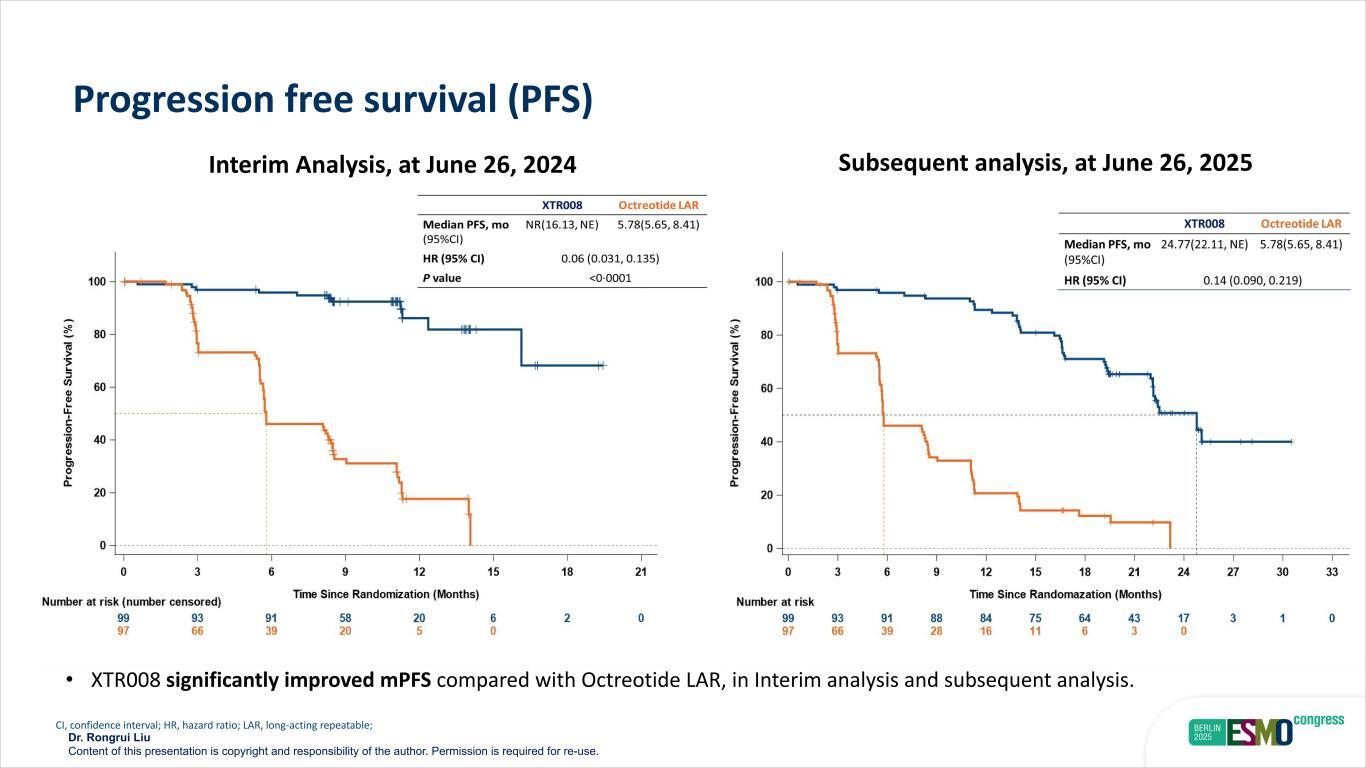 在此前的期中分析中,XTR008已取得非常显著疗效。本次在2025年ESMO大会上公布的最新数据进一步证实了XTR008的持久疗效和生存获益。