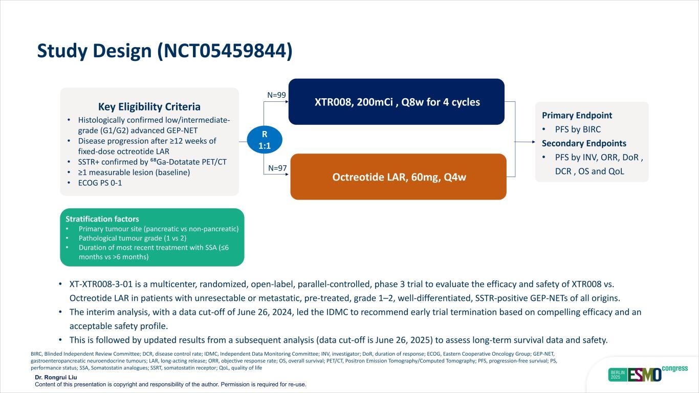该临床研究是国际上首个针对标准剂量的长效生长抑素类似物治疗失败的胃肠胰腺神经内分泌瘤开展的肽受体放射性核素治疗(PRRT)III期临床研究,也是中国第一个针对神经内分泌肿瘤开展的PRRT的III期临床研究。该研究旨在评估在1-2级、分化良好的胃肠胰神经内分泌肿瘤(GEP-NETs)患者中镥[¹⁷⁷Lu]氧奥曲肽注射液(XTR008)对比长效生长抑素类似物的疗效。