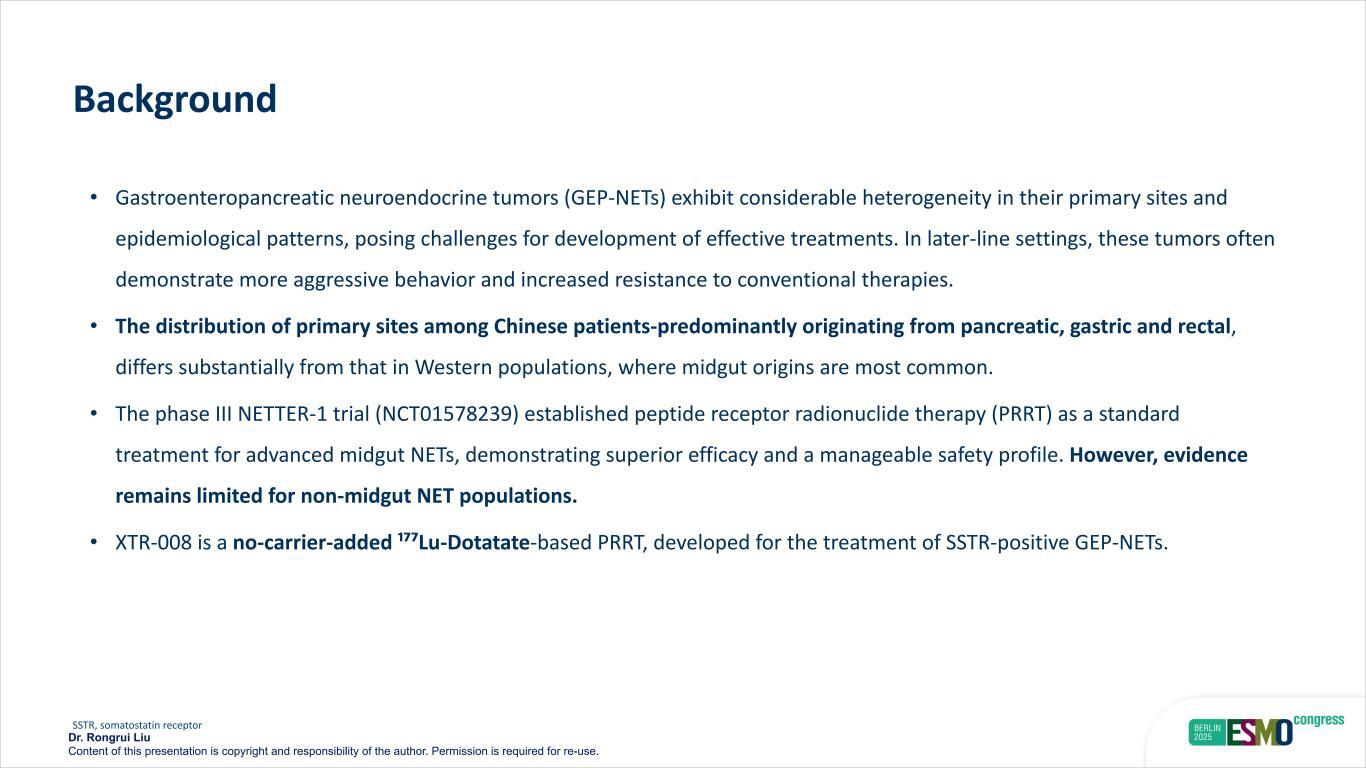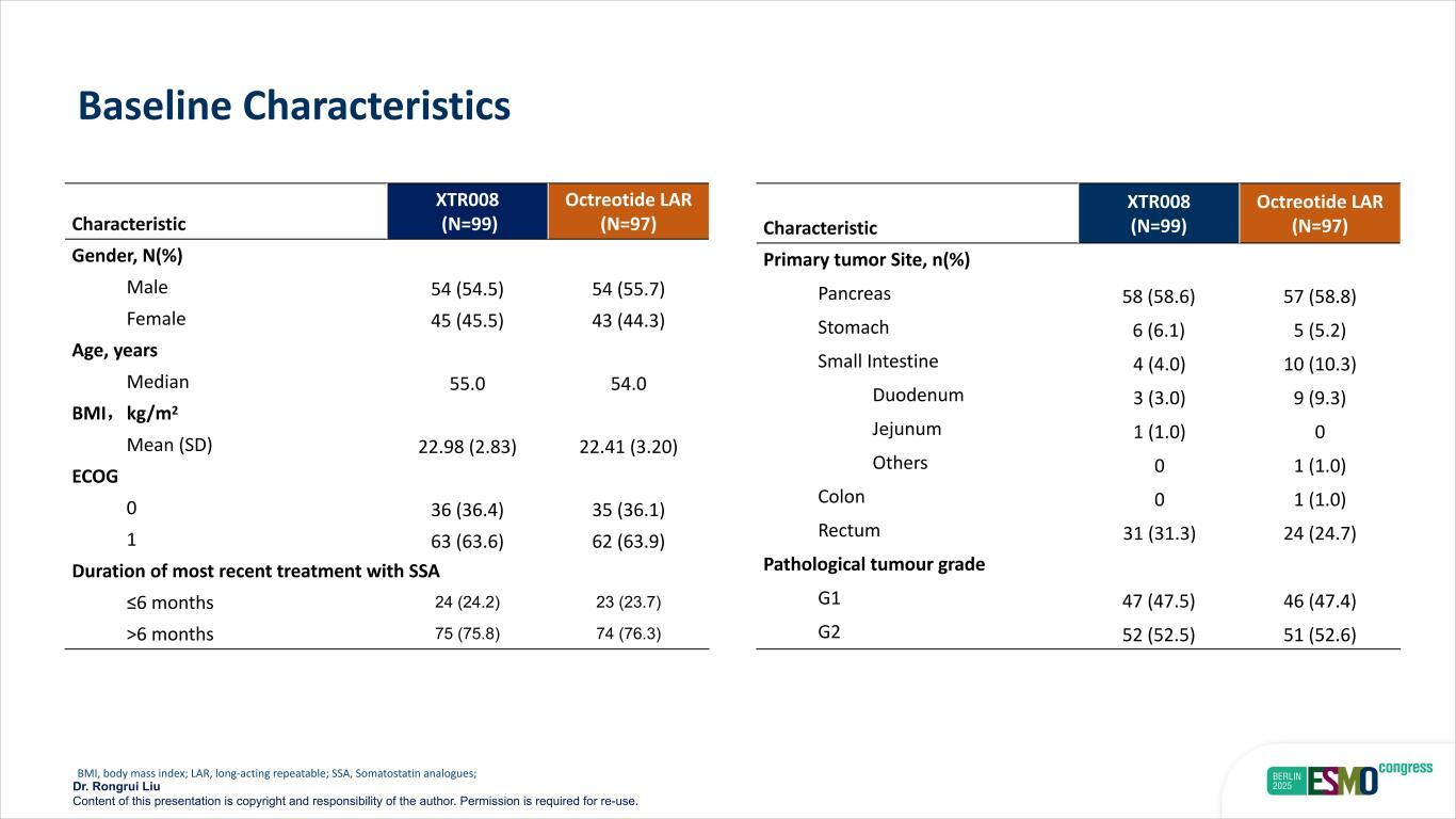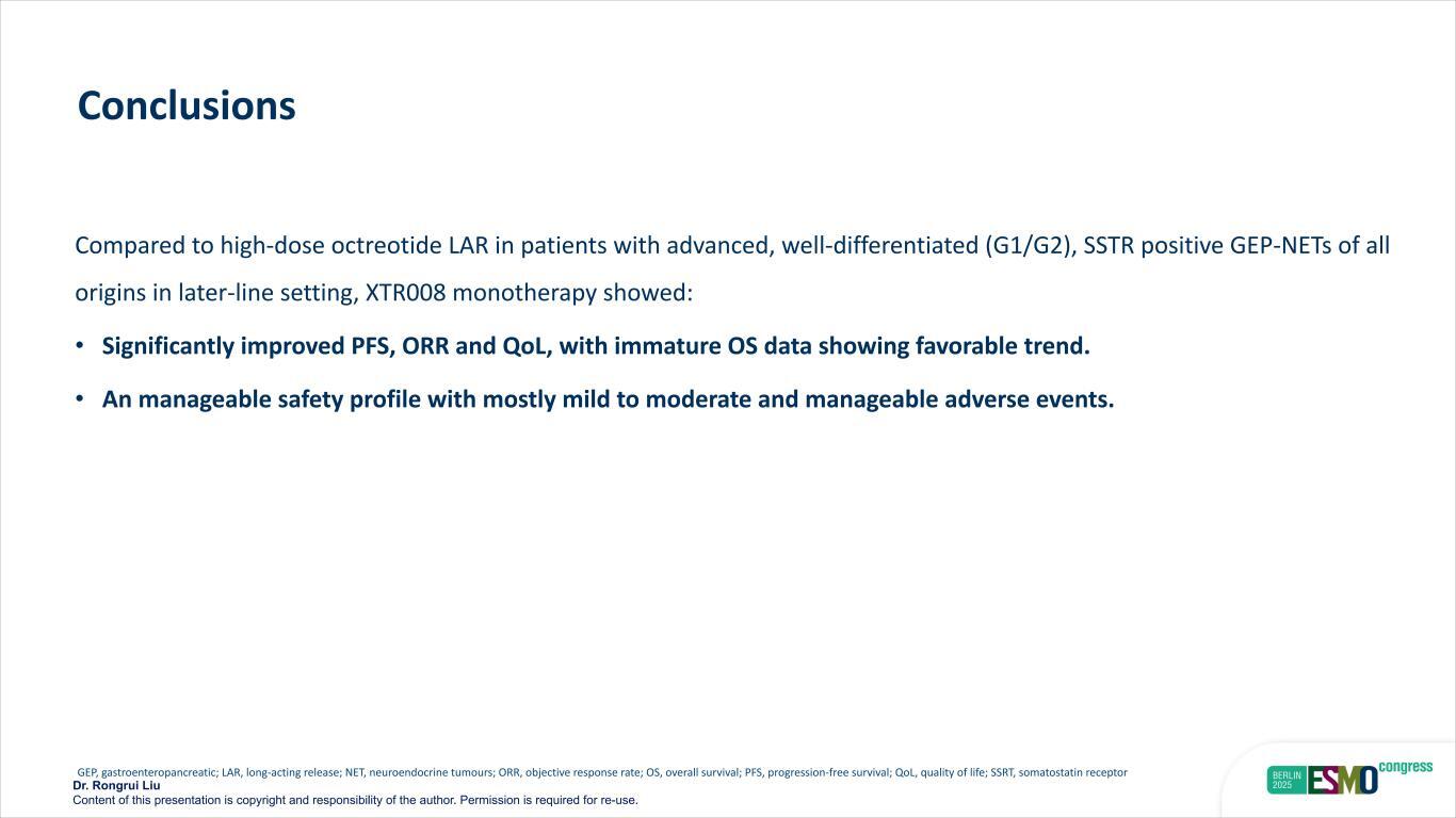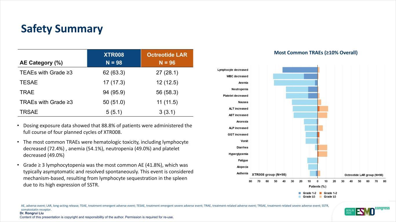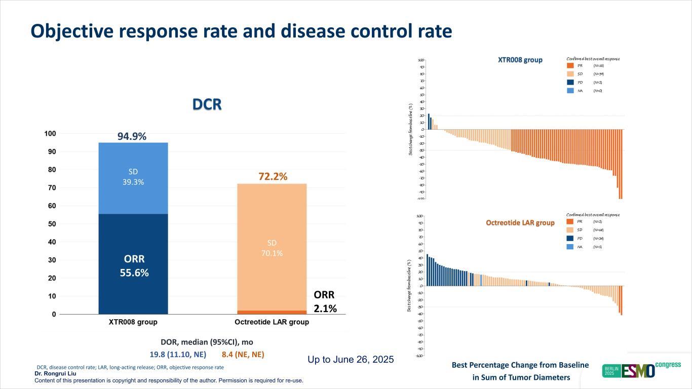 该研究覆盖胰腺、直肠、胃等多种原发部位的GEP-NETs患者,并在各亚组中均观察到一致的疗效趋势,表明XTR008作为一种广谱、高效的后线治疗方案,具备显著的临床潜力与应用前景。