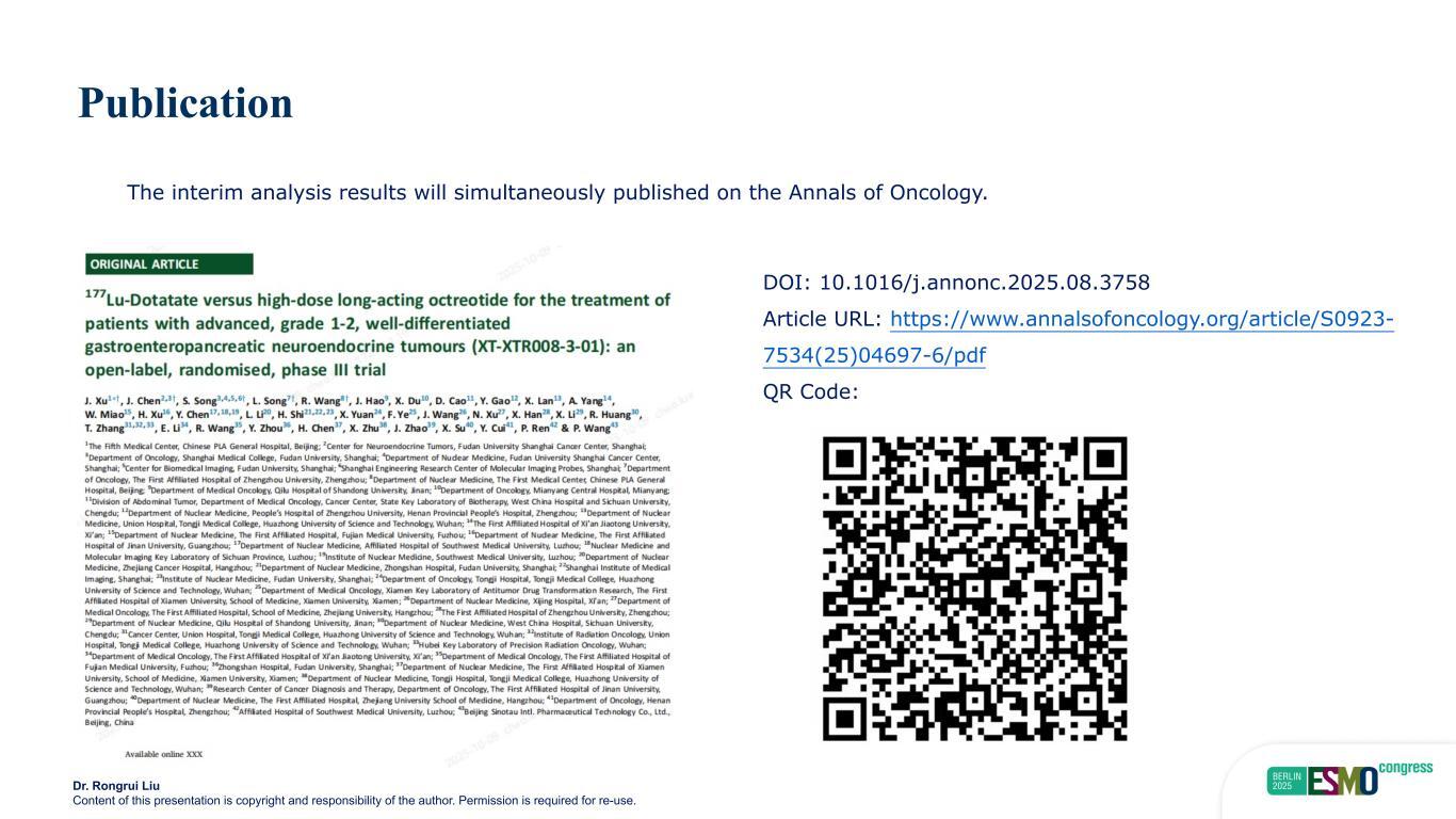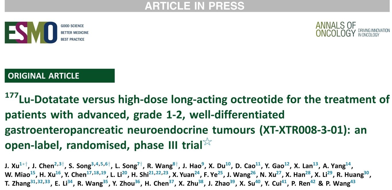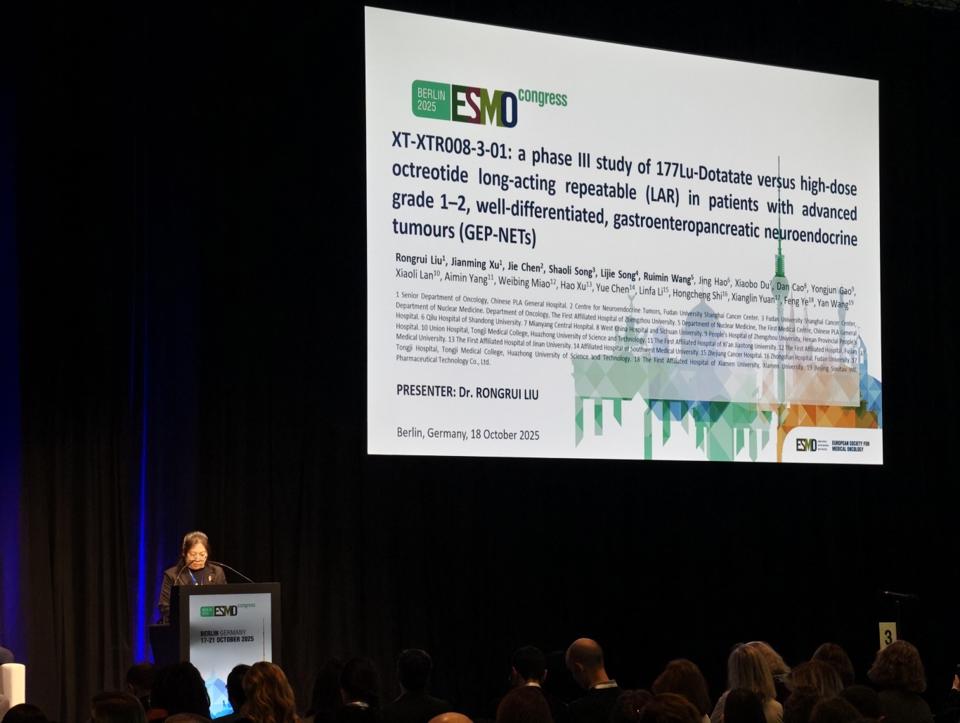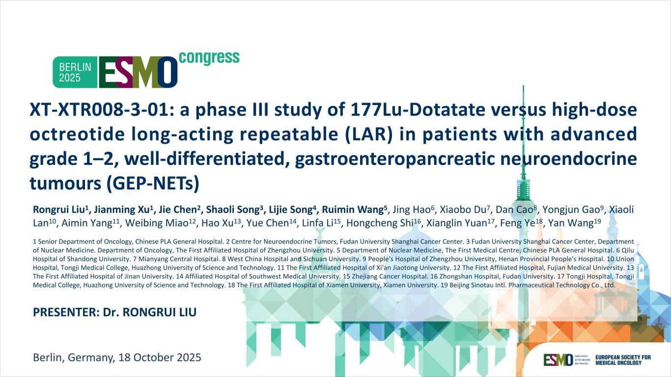 先通医药欣然宣布,公司自主研发的放射性核素治疗药物XTR008中国III期临床研究成果已正式于肿瘤学国际顶级期刊Annals of Oncology(影响因子:65.4)发表。同时,该研究最新分析结果成功入选本届ESMO大会LBA(Late-Breaking Abstract,最新突破性摘要),并在ESMO年会优秀论文会议(Proffered Paper Session)上,由中国人民解放军总医院刘容锐教授作口头报告,向全球肿瘤学界展示XTR008作为单药治疗神经内分泌肿瘤的卓越临床表现,引起了与会专家和学者的广泛关注和热烈讨论。这是国内少数实现ESMO大会与国际顶级学术期刊同期发布的研究成果之一,充分彰显了XTR008在神经内分泌肿瘤治疗领域的重大价值与国际影响力。