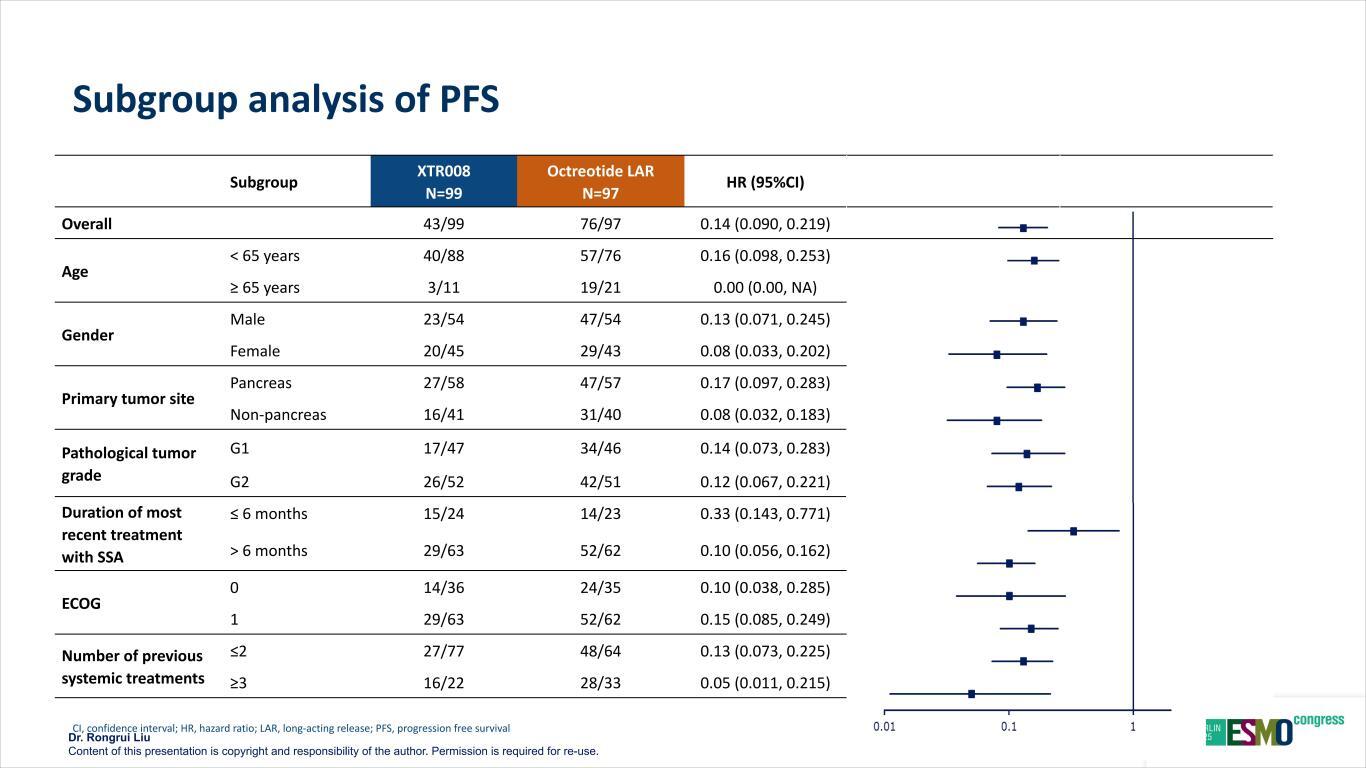 分析显示,XTR008组的中位无进展生存期(PFS)达到24.77个月,显著优于长效生长抑素类似物组的5.78个月(HR=0.14,95% CI: 0.090-0.219),表明XTR008可将疾病进展风险降低达86%。