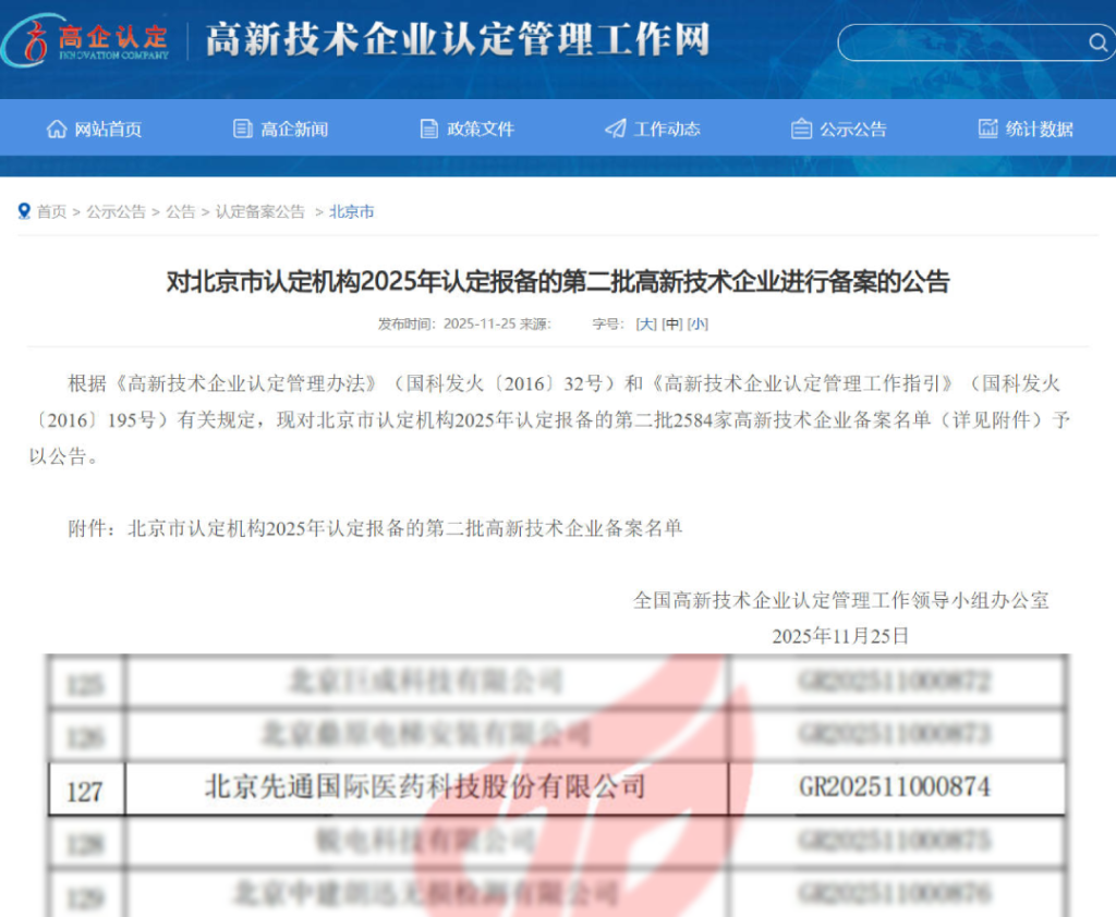 近日,全国高新技术企业认定管理工作领导小组办公室公示了北京市认定机构2025年认定报备的第二批高新技术企业备案名单。先通医药顺利通过复审,被认定为“高新技术企业”。这是公司第三次获得该项荣誉,体现了公司在研发组织管理水平、科技成果转化能力、自主知识产权、研发投入力度、人才团队建设及成长性等方面持续获得国家层面的高度认可。